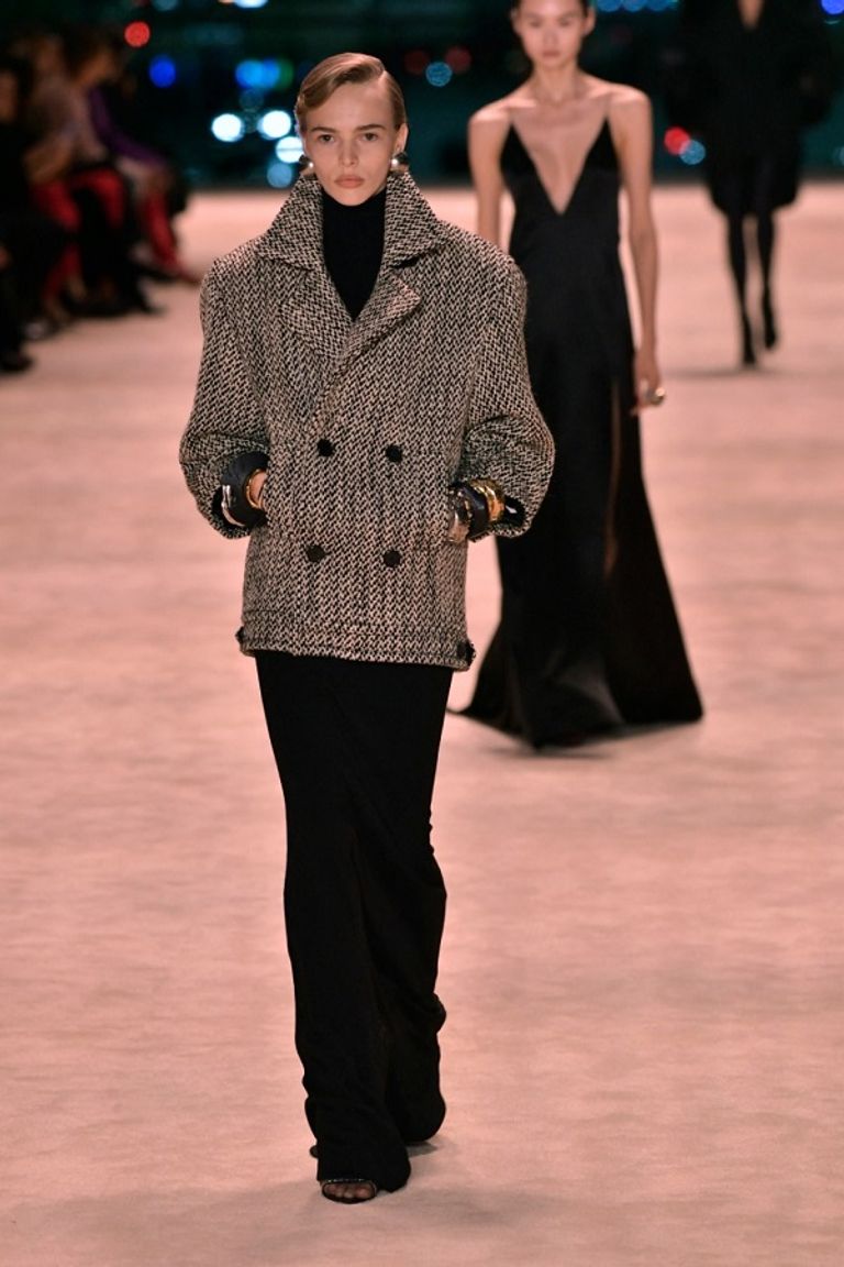 وأوجد فاكاريلو من خلال المعاطف العريضة والسميكة توازناً مع التصاميم الشفافة العزيزة عليه. وشملت تشكيلته فساتين طويلة على امتداد الجسم كله، في حين اتسمت سترة “السموكينغ” التي تعتبر أساسية لدى “سان لوران” بأنها أعرض هذه المرة.